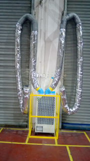 解决方案:使用公司SAC-45工业冷气机机型,制作6米长冷风延长管,利用滑轨在装箱时把冷风管通到车厢内,进行整体降温,改善箱体内工作环境。